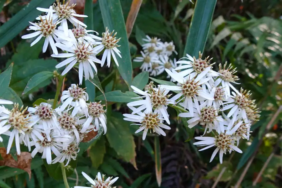 日陰の林縁や林内に生える多年草。葉は先のとがった楕円形で荒い鋸歯があります。茎の先に白い花を多数付けます。舌状花は白色でやや長いのが特徴。
