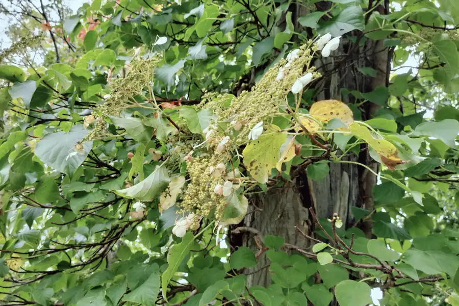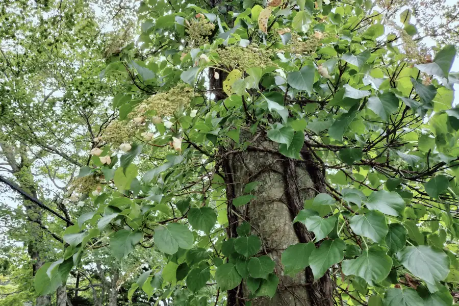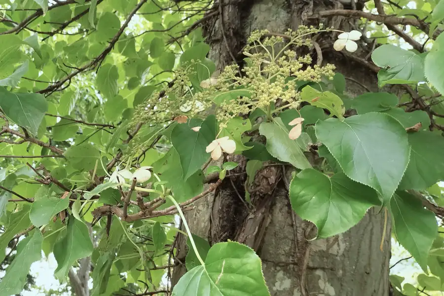 幹や枝から細い気根を出して絡みながら這い上って、高さ10~15mくらいになります。ガクアジサイに似た花を付けます。