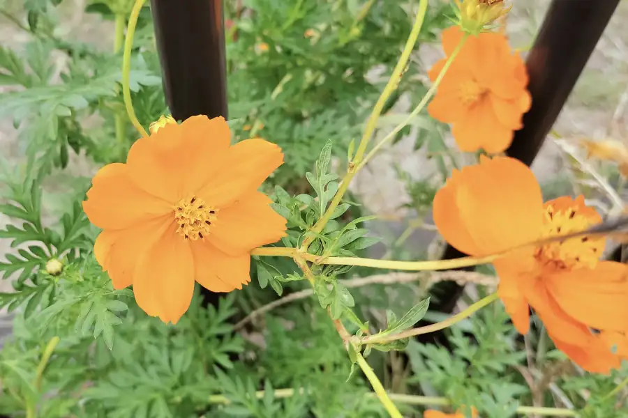 花の色はオレンジ色から黄色、舌状花は8枚で先が3裂する、葉は羽状に深く裂ける。