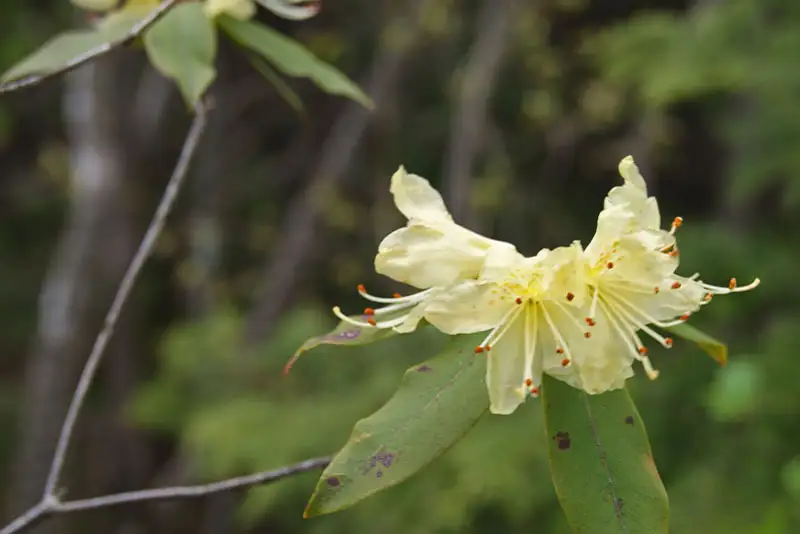 葉は互生し細長い楕円形で先が尖る。花は枝先に2~4輪付き淡黄色の漏斗状、上側内面に濃緑色の斑点がある、花冠は5裂する。おしべは10本。