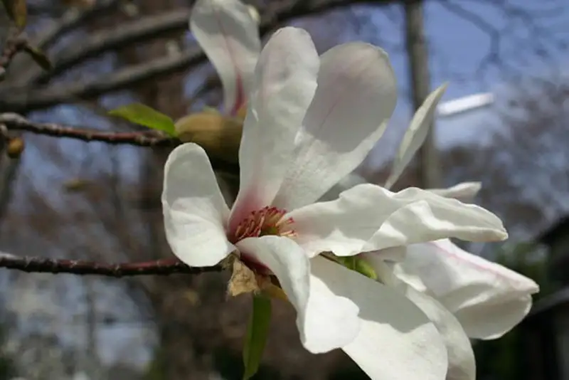 早春の時期、葉の展開していない枝先に大きな白花を付けます。花弁は6枚で基部は桃色を帯びます。果実はにぎりこぶし状のデコボコがある。これがコブシの名前の由来です。