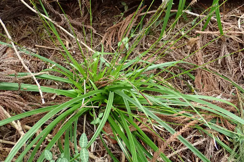 葉の幅は5~10mm、断面がV字状になることが特徴。良く似たミヤマカンスゲはM字状になる。