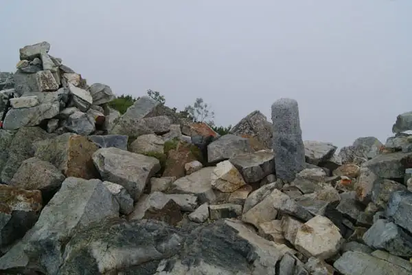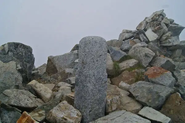 爺ヶ岳南峰は岩が積み重なる山頂です。岩の中に頭が丸い主三角点があります。