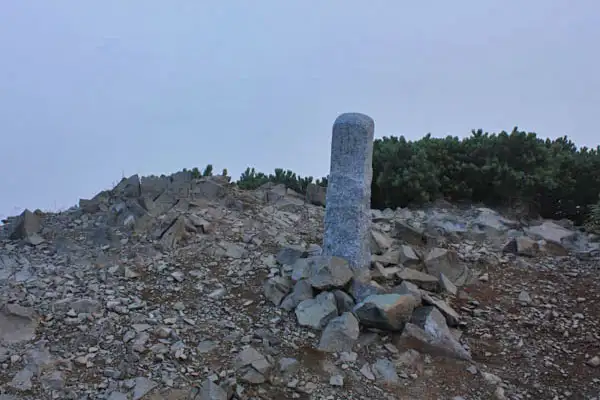 五龍山荘から遠見尾根へと下っていく小さなコブは白岳です。頂の上には頭が丸い主三角点がありました。石面には山の文字が読み取られます。