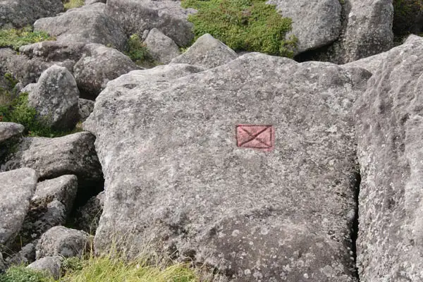 編笠山に登る岩の上に赤くペイントされた×マークがありました。自然石に刻まれた宮標石と思われます。