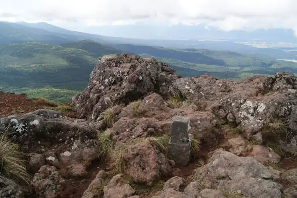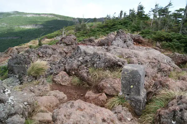 茶臼山からシラビソの林の中をたどると展望台です。小さな岩場の上に4等御料局三角点があります。