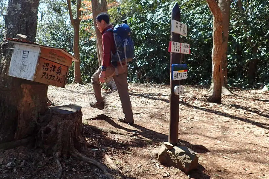 大平山の山頂に中部地建の三角点があります。山頂広場は木立に覆われ展望はありません。