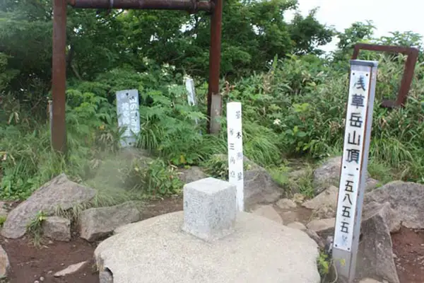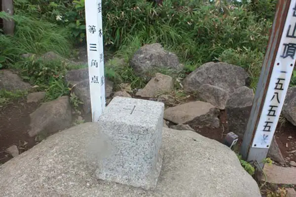 ネズモチ平から山頂を目指しました。田子倉湖を見下ろす山頂には石祠とコンクリートで固められた三角点があります。