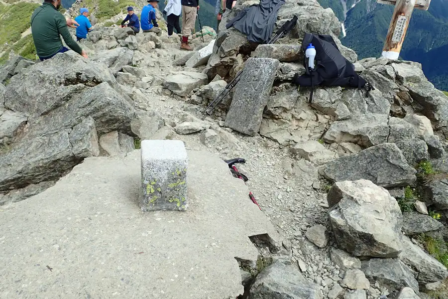 藪沢カールの上にそびえる岩峰は鳳凰山や北岳を一望する頂です。山頂標識の傍には三角点がありました。
