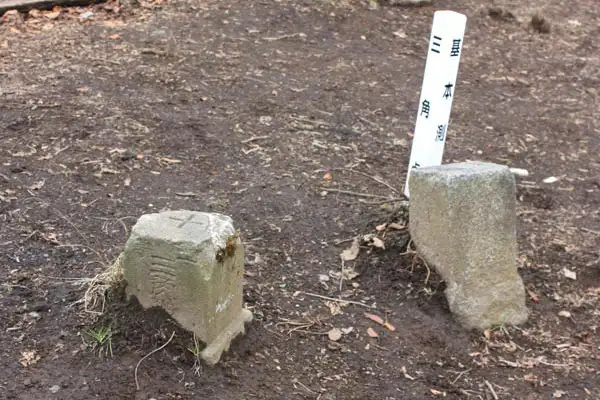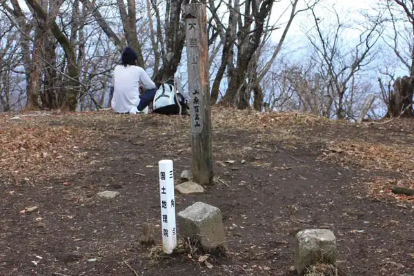 大室山の山頂は木立に覆われて展望はありません。山頂広場には山梨百名山の道標と三角点があります。三角点の隣には文字が消えて読めない標石がありました。