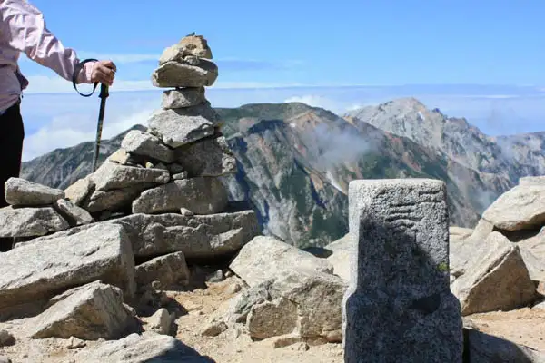 白馬岳と五竜岳を結ぶ稜線上のピークです。目の前には不帰嶮の岩場が続きます。山頂には山頂標識やケルンとともに三角点があります。