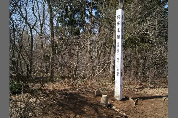 角田山はミスミソウの咲く山として知られています。三角点は山頂の西寄り避難小屋の近くにあります。国土地理院の成果では柱石毀損、処置保留となっています。