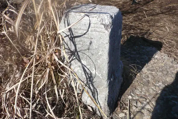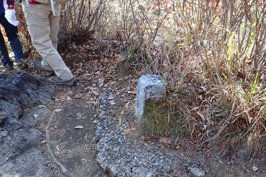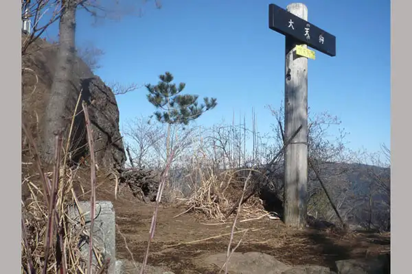 道の駅たけやまから見上げる小さな岩山、小さな鎖場を登った大天狗の頂には女岩があります。登山道脇に三角点がありました。