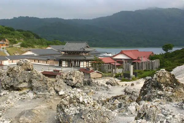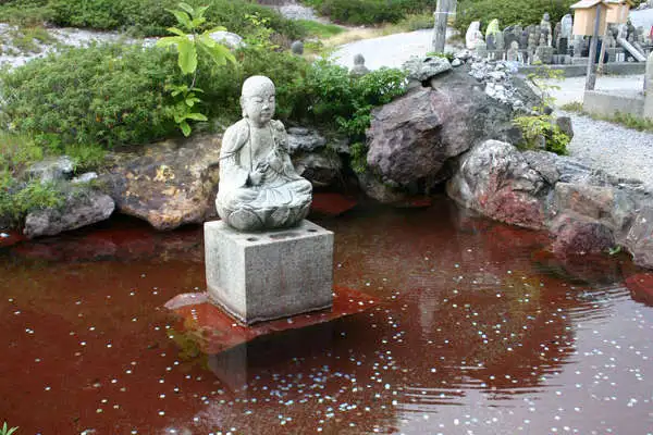 地蔵堂に参拝した後、硫黄の匂いが鼻を付く地獄めぐりです。黒く変色した岩には無間地獄など地獄にちなんだ名前が付けられています。八角堂の奥には血ノ池地獄と名付けられた小さな池、その奥は賽ノ河原など、付近はまさにここは地獄の世界です。