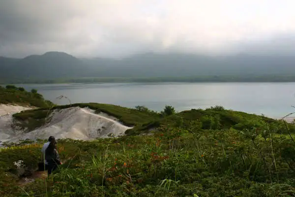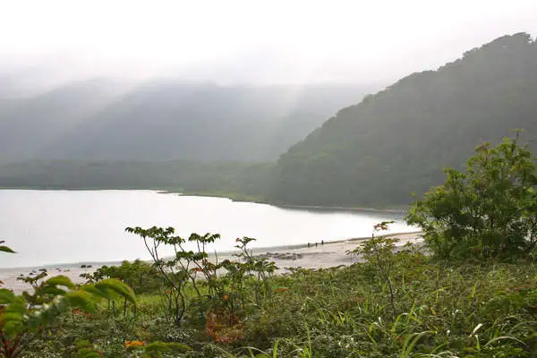 やがて宇曽利湖の湖畔に出ると白い砂浜です。ここは極楽の世界とか。青い水をたたえる湖の先には外輪山の八峰が並んでいるようですが今日は低い雲の中にその姿を隠していました。