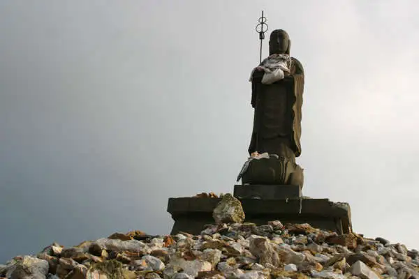 恐山に向かう県道4号線は参道として古くからたくさんの人が歩いた道のようで、道端には赤い着物を着た観音象が祀られています。この世とあの世を分ける三途の川という赤い太鼓橋の脇を進むと広い駐車場です。すでに4時を過ぎていましたが観光バスなども停まっていました。