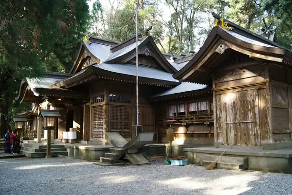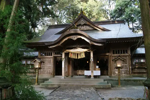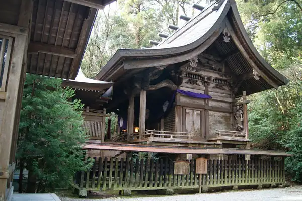 暗い杉林の参道を進むと拝殿と本殿が建っていました。国の重要文化財にも指定されているという本殿には木彫りの彫刻も施されています。