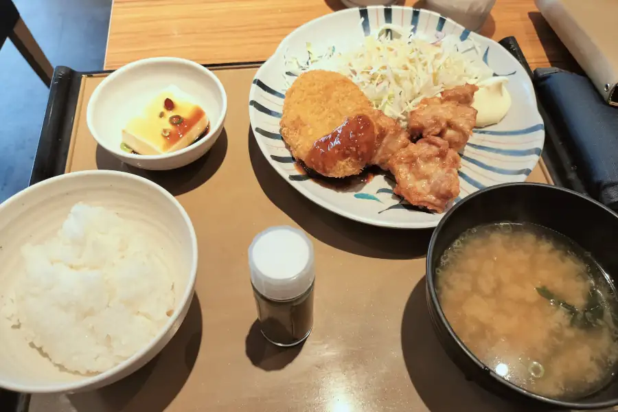 金町駅前の高架橋から道を折れると京成金町駅、その先はJR金町駅のロータリーです。駅前は北側のほうが飲食店なども多いようです。学生などが多く出入りしているやよい軒でお昼ご飯にしました。
