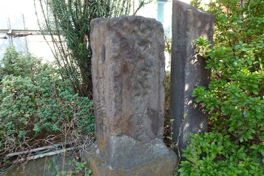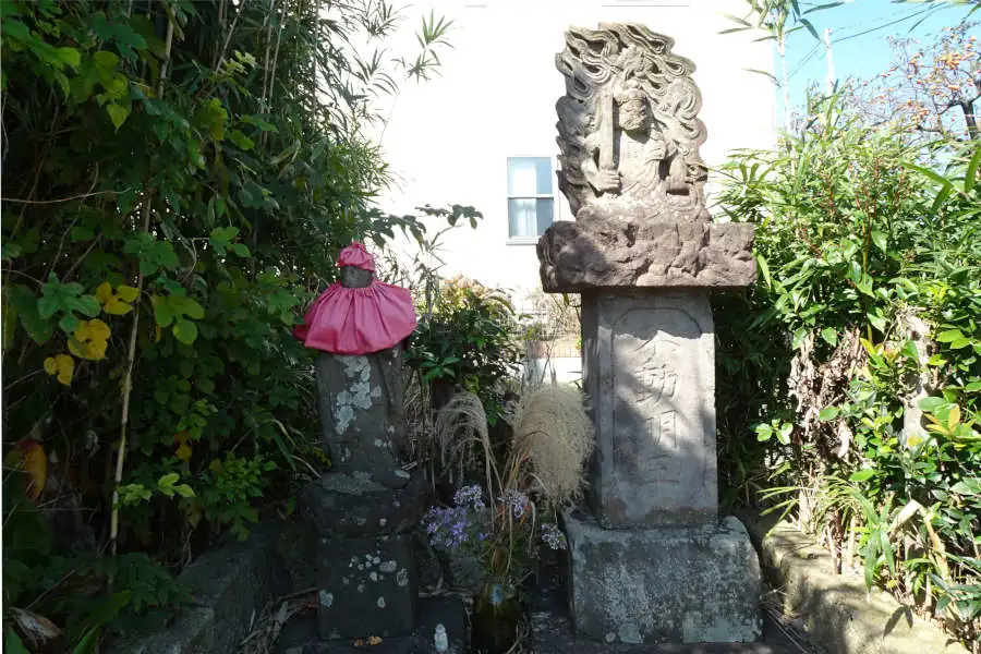 途中、道を左に折れ福泉寺と小動神社に立ち寄りました。判り難い住宅地の中の道をしばらく歩いたところには古い不動明王の石柱があります。大山道標と似たような不動明王を頭にのせた石柱です。