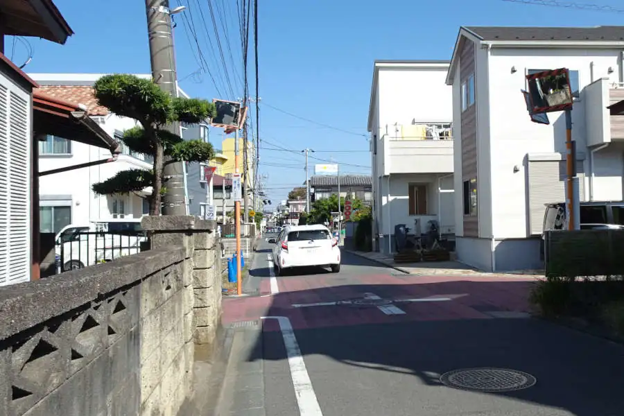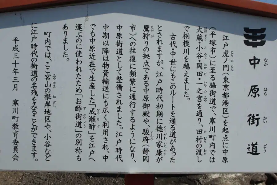 住宅地の中に続く旧街道は墓地の傍から細い右手の道へ、途中には中原街道の案内板がありました。中原街道は江戸時代の初期に整備され、徳川家康の鷹狩の拠点である中原御殿や駿府への往来に利用されるようになりました。江戸中期以降は物資の輸送にも広く利用され、中原付近で生産した「成瀬酢」を運ぶためにも使われ「お酢街道」と呼ばれていたと紹介されていました。