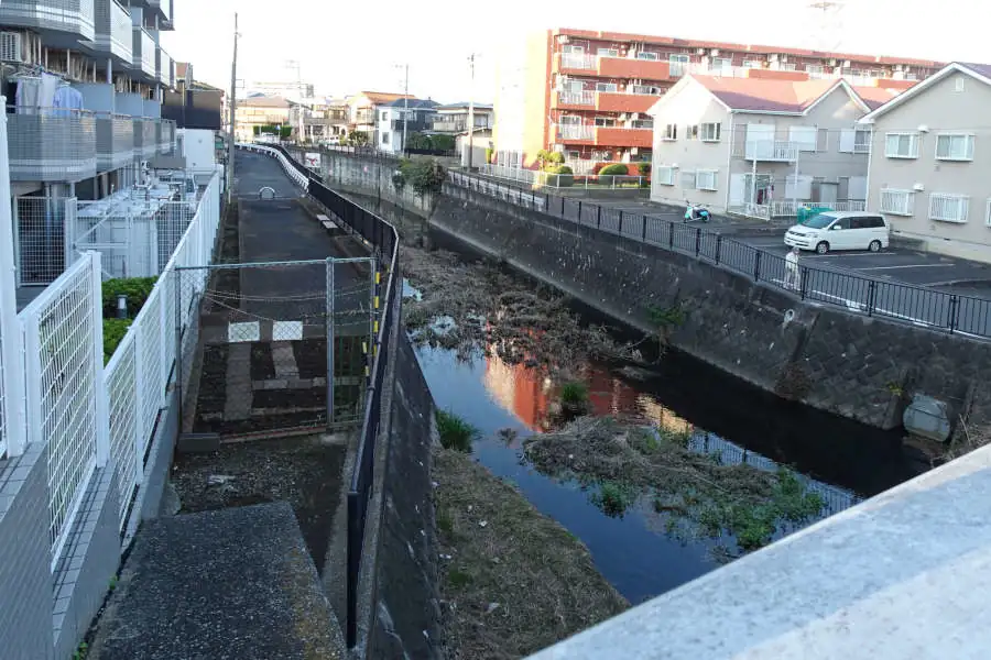 厚木飛行場を越え緩やかに下ると引地川の新道下大橋です。引地川は厚木飛行場の北、泉の森付近を源流とし藤沢市、鵠沼海岸へと下って行く川です。
