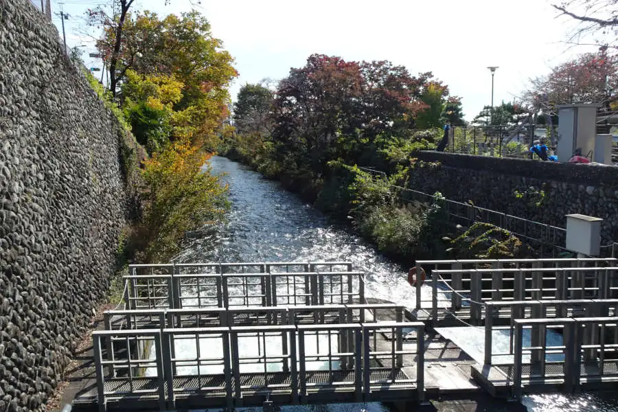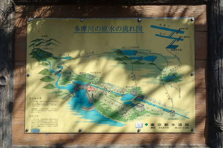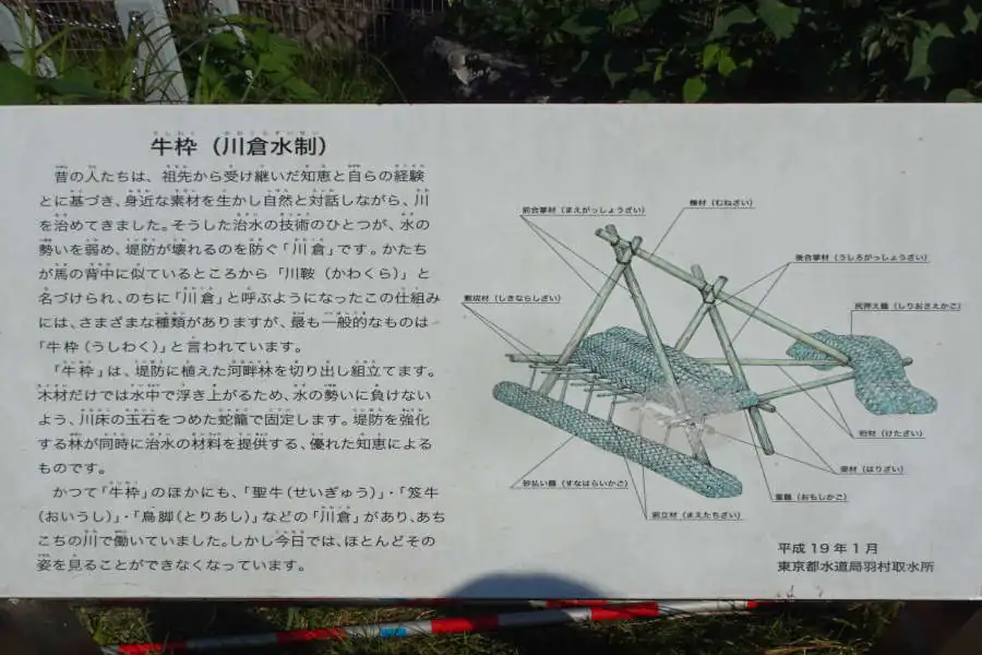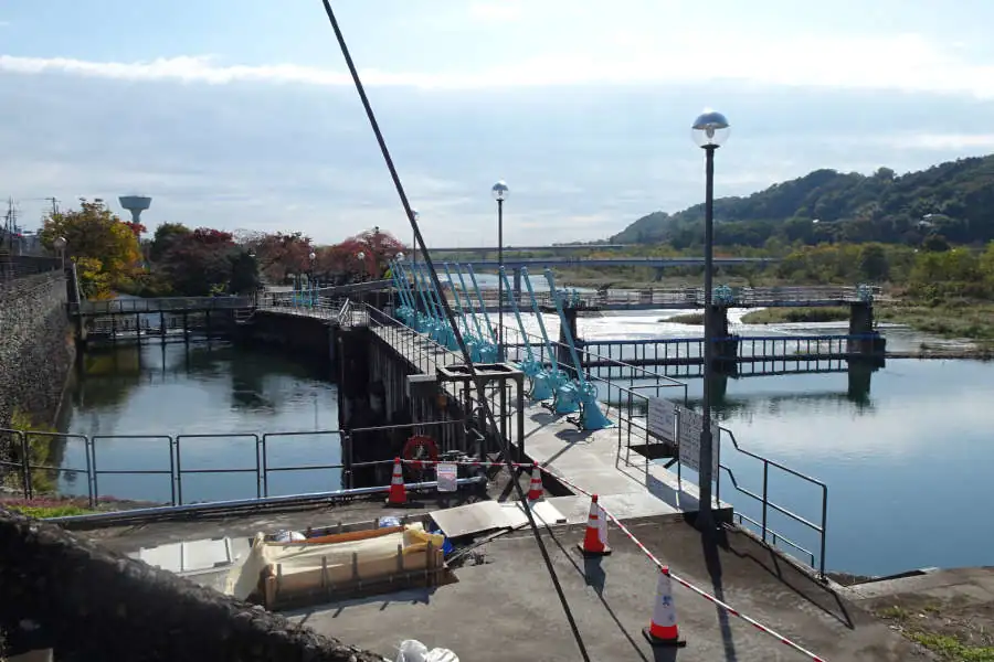 玉川取水口には2つの水門が設けられ、第1水門・第2水門と呼ばれています。第1水門は木製の投渡堰(なげわたしぜき)とその後造られたコンクリートの固定堰を組み合わせた珍しい構造です。増水時、投渡堰では木製の杭を流し玉川上水への水量を調整する工夫がされていると言います。