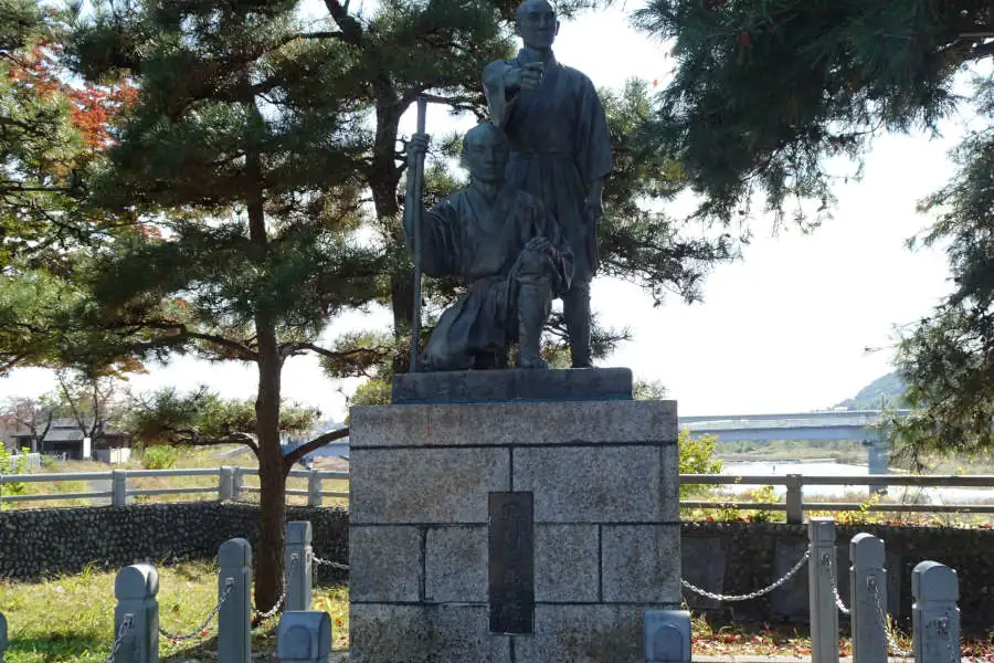 住宅地の中を進むと玉川上水の取水口、多摩川の流れの中に取水堰があります。取水堰の公園には玉川上水を完成させた玉川庄右衛門、清右衛門兄弟の銅像がありました。