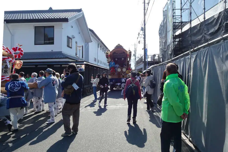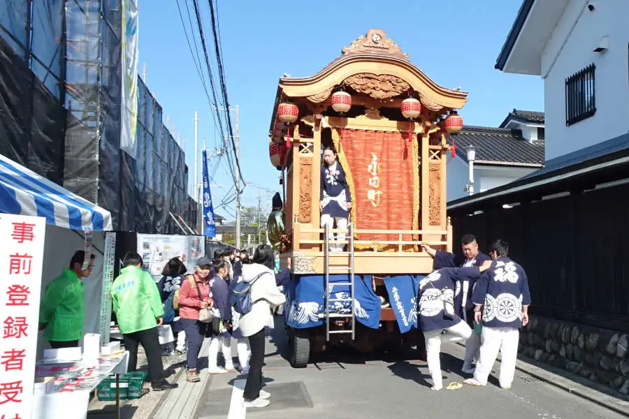 紅葉が始まる遊歩道をしばらく歩くとたくさんの人が行列を作っています。長徳禅寺の前の土蔵造りの建物は田村酒造で、この日は福生蔵開きが行われているようです。お祭りの山車も出ていて祭囃子が聞こえていました。