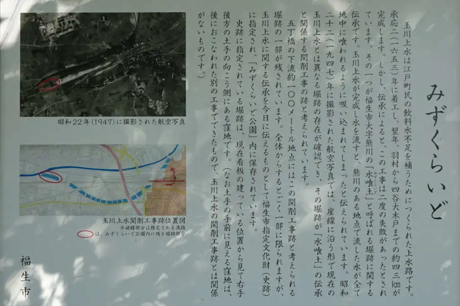 水喰土公園(みずくらいどこうえん)には玉川上水の掘削に関わる伝承があります。当初の工事は立川段丘崖線に沿って掘削されましたが水は地中に吸い込まれ工事は失敗、玉川上水は現在の青梅線の北を迂回して掘削されたと言います。細いふみ跡が続く窪地には水喰土堀跡の表示板がありました。