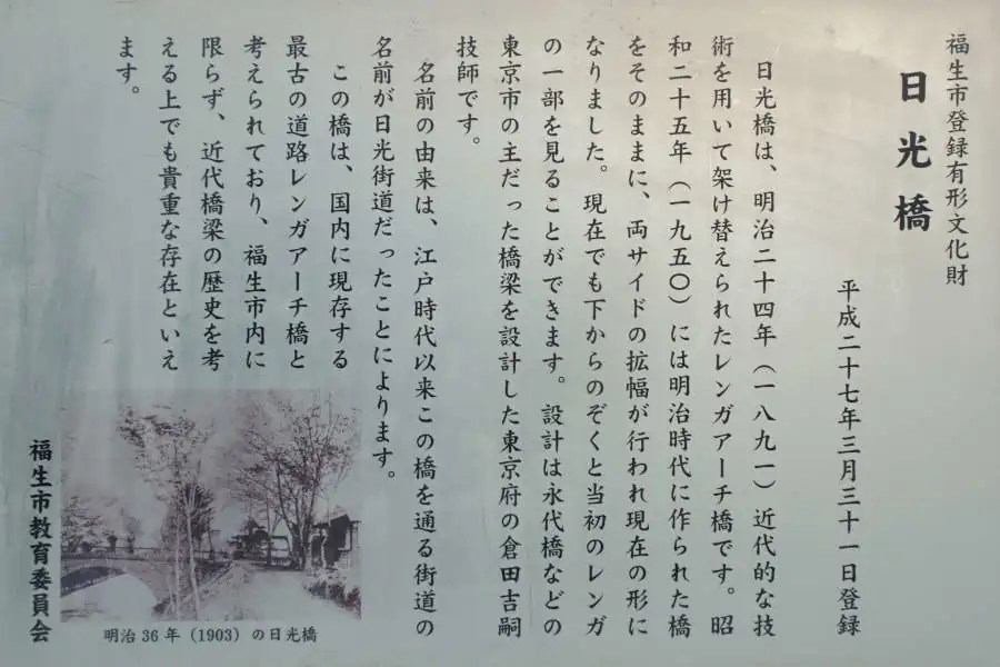 玉川上水の遊歩道は八高線の高架の下を通り拝島駅にたどり着きました。玉川上水には日光橋が架かっています。明治に建築されたレンガ式のアーチ橋で、国内に現存する最古の道路レンガアーチ橋と言います。