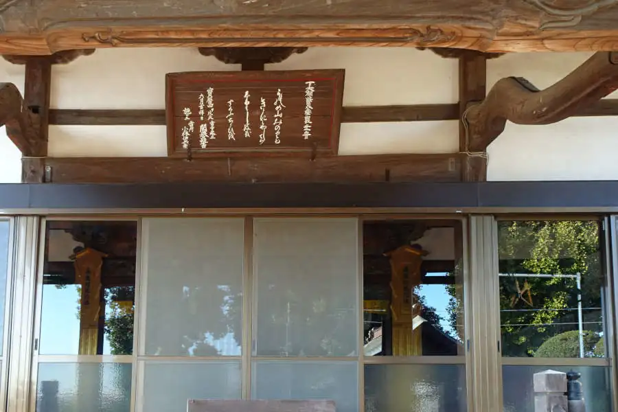 急な石段を登って行くと大きな本堂がありました。本堂には准秩父観音霊場の第三十四番札所のご詠歌が掲げられていました。