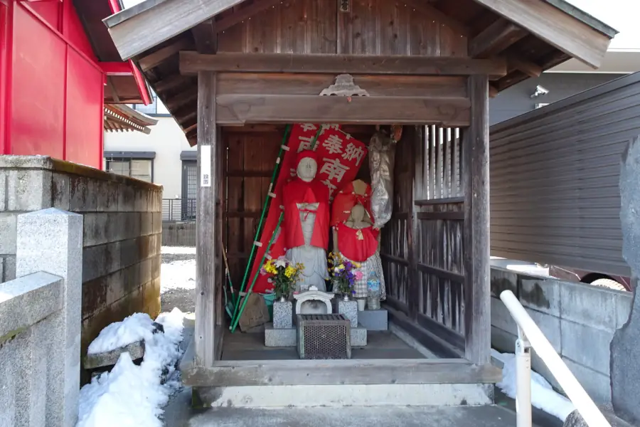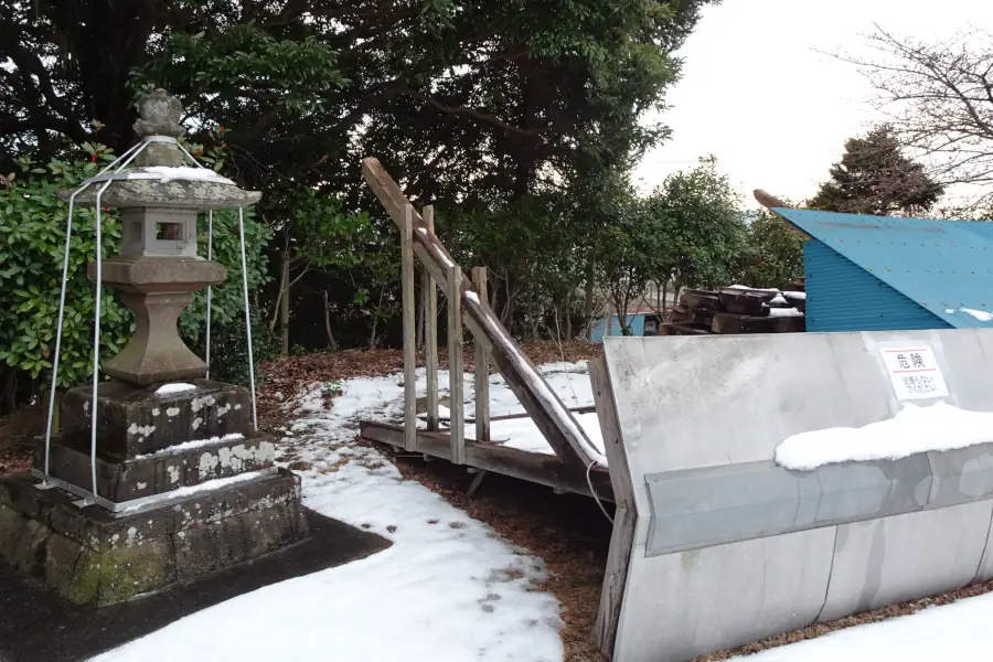 住宅地の中の坂道を登ると小山御嶽神社です。境内の石灯籠は地震対策なのか固定され、その傍の大きな奉納札掲示板は崩壊していました。今回の雪のせいではないのかもしれませんが神社の管理もなかなか大変と言うことなのでしょう。
