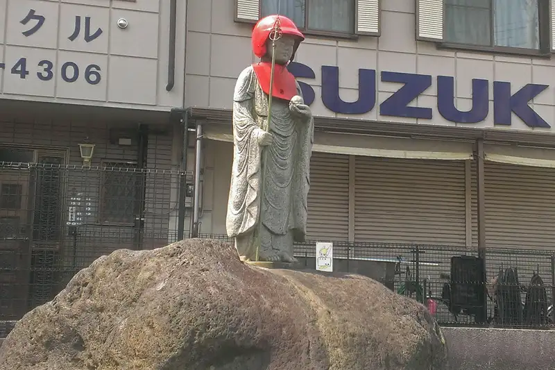 阿久和川の遊歩道近くの道路に赤いヘルメットを被ったお地蔵さんが祀られていました。