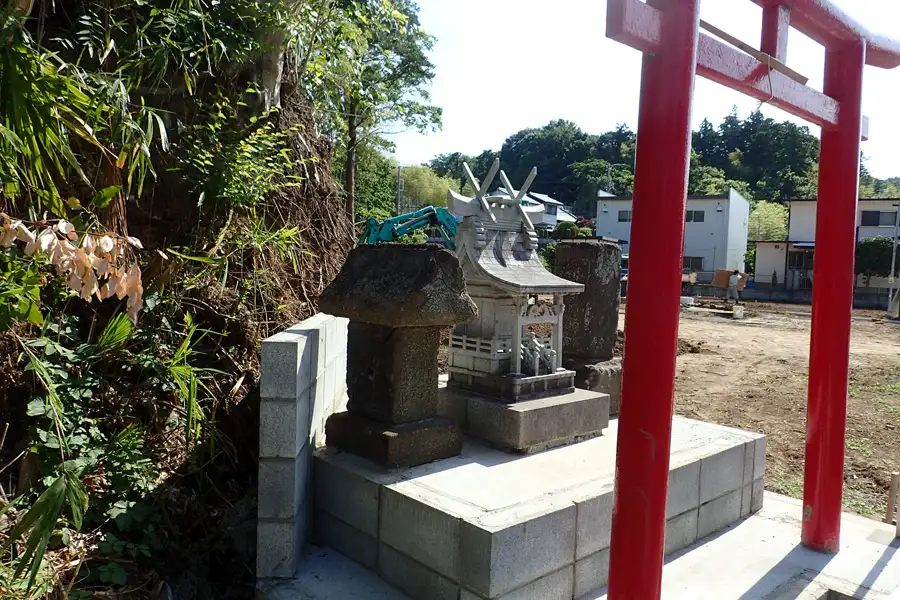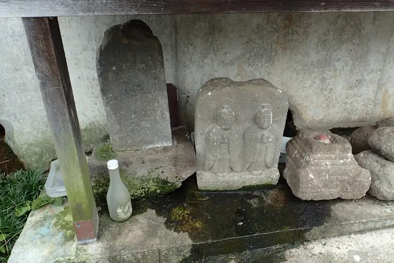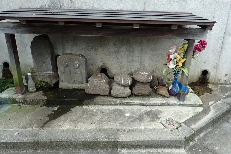 泉区新橋の住宅地の中に道祖神が祀られています。付近の道路は補修工事などで付け替えられたようでコンクリートの壁の前に道祖神と壊れた石塔が祀られていました。