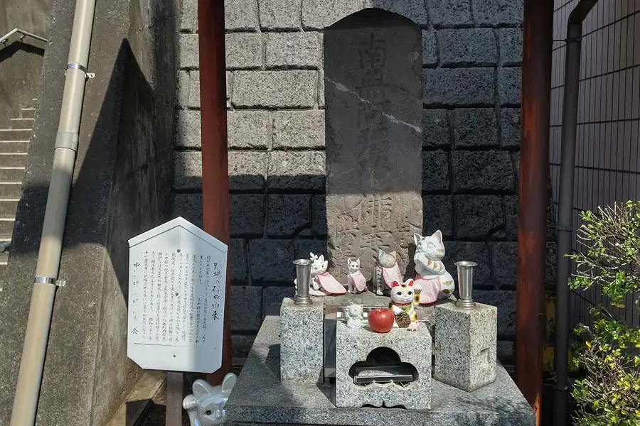 踊り場の地下鉄駅近くに寒念仏塔があります。現地の案内板によると踊り場の地名は古猫が集まり毎夜踊ったとされるもので、念仏寒供養塔の前には招き猫などが祀られていました。