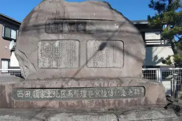 岡地地域ケアプラザ近くに土地区画整理事業の記念碑があります。近くには庚申塚や石仏があります。