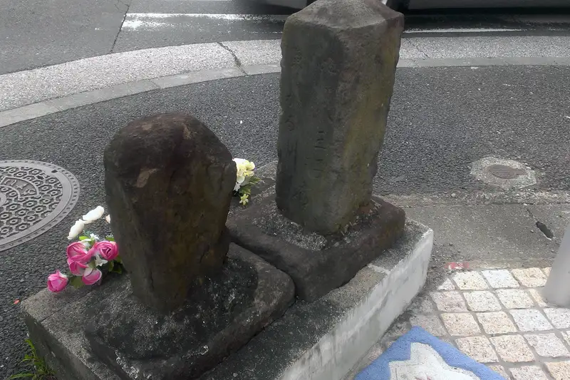 交差点の片隅には風化した庚申塚が祀られていました。