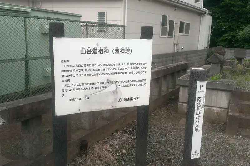 阿久和坂上交差点を西に進むと山谷の道祖神があります。現地の案内板によるとここの道祖神は五輪塔の珍しいもの、双神の道祖神も祀られています。