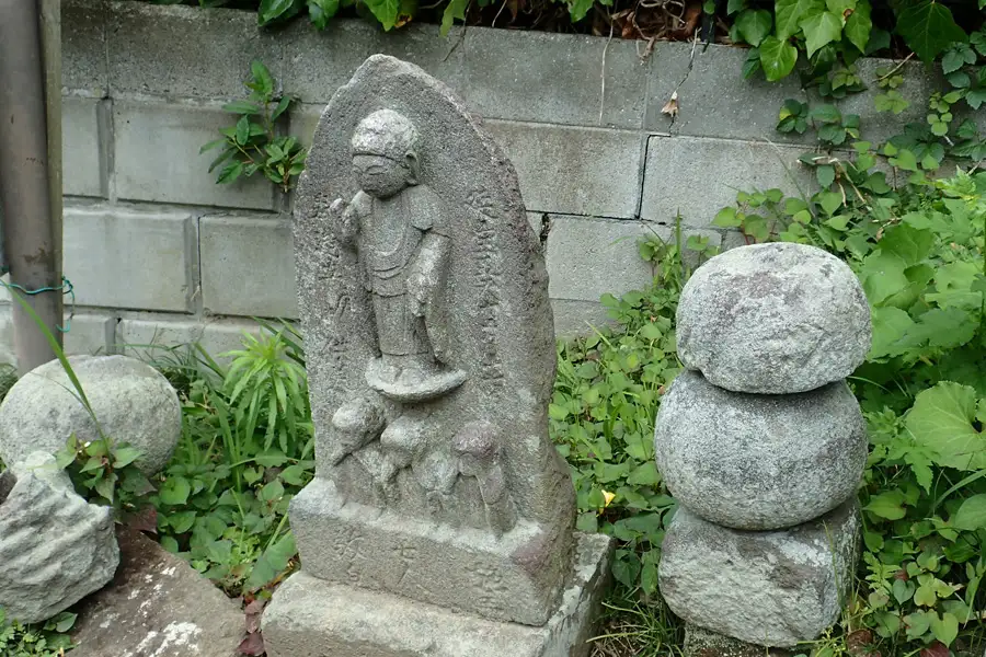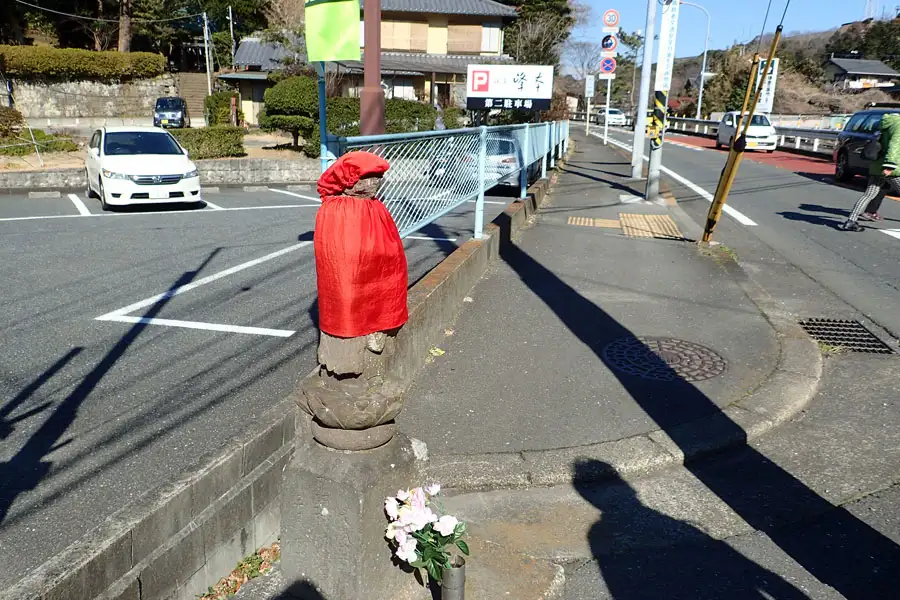 金沢街道に面したお坊橋近くに赤い涎掛けを掛けたお地蔵さんが祀られています。