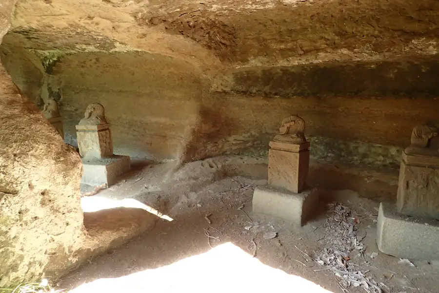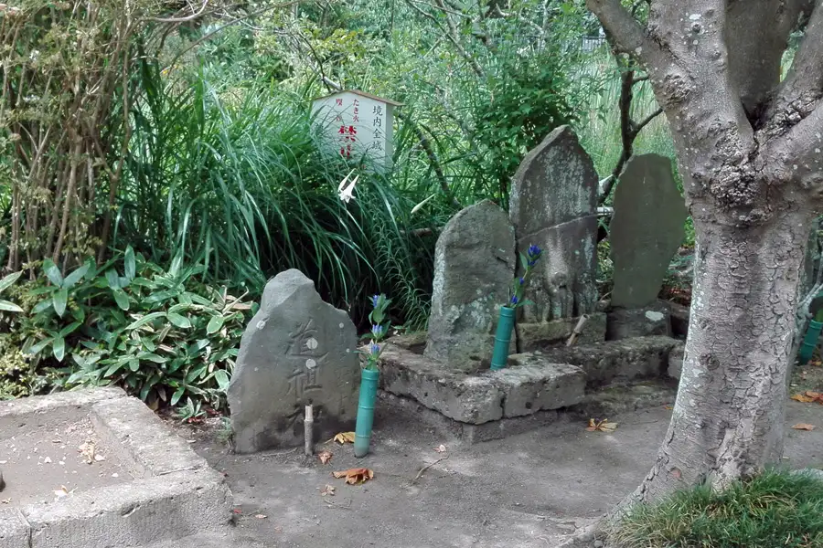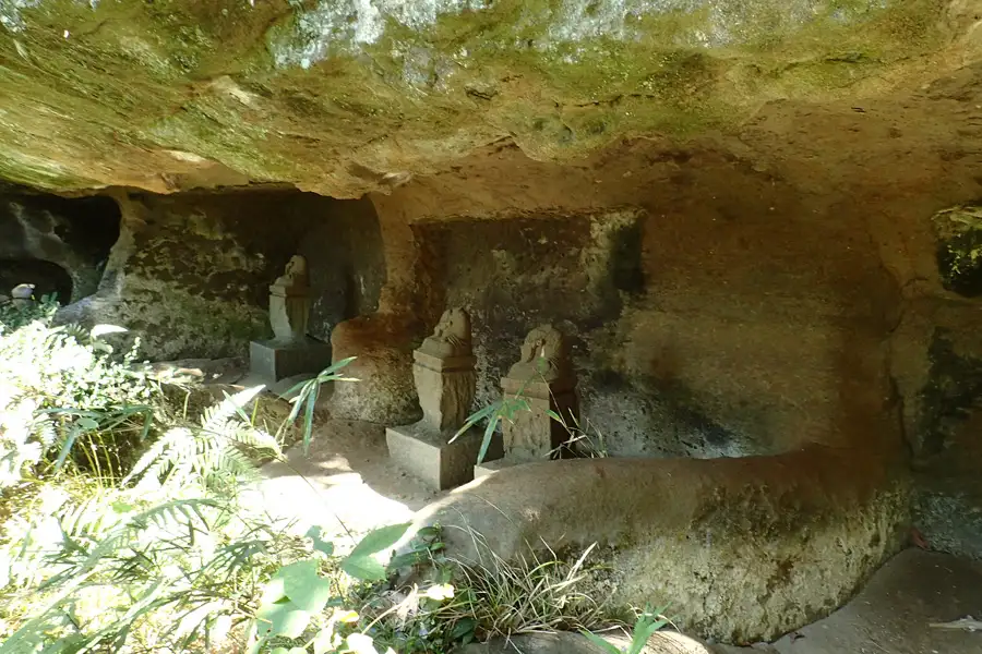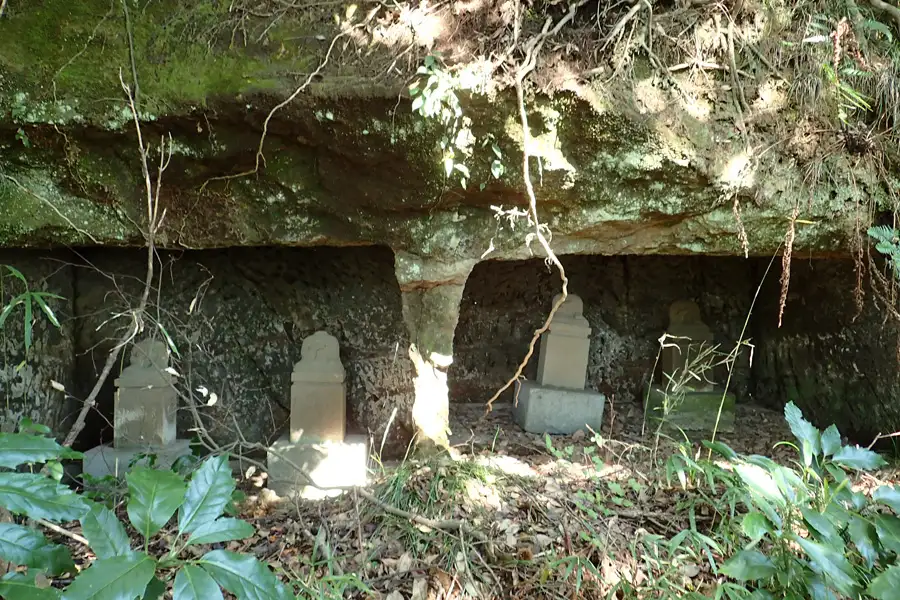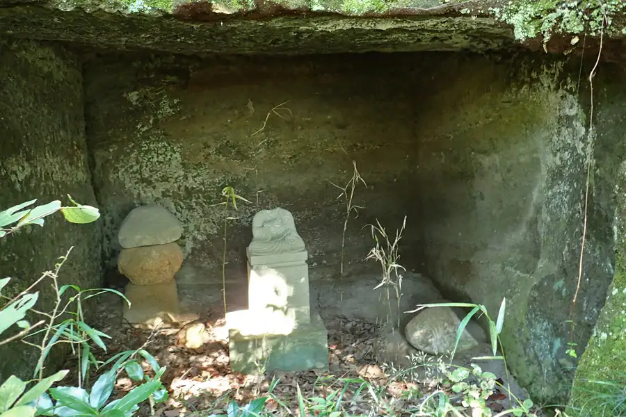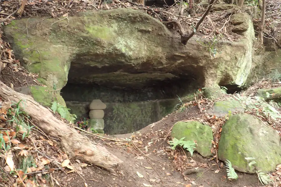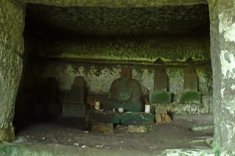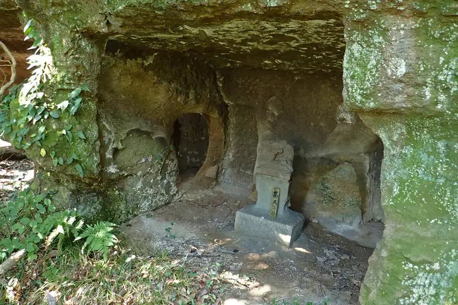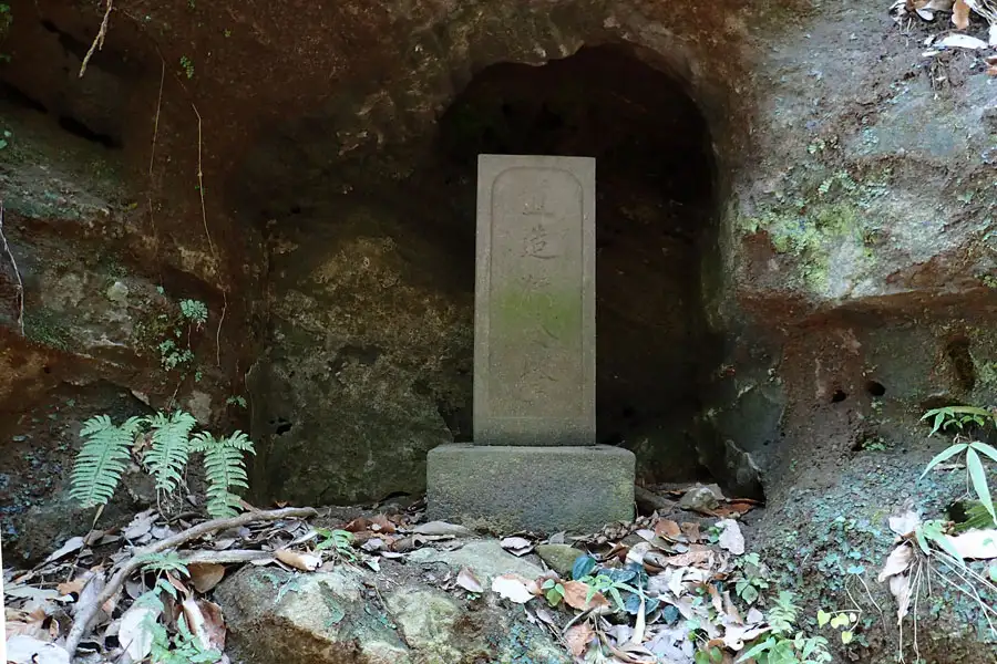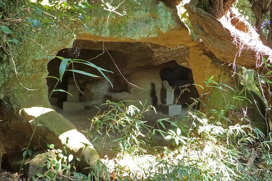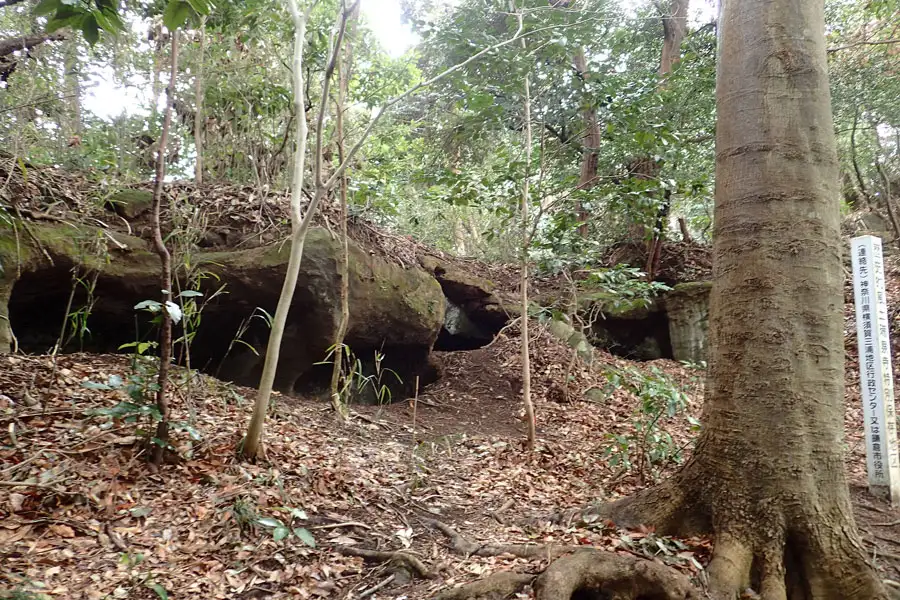 北条高時を祀ると伝えられるやぐらは3つの岩窟からなり、中央の岩窟には風化した五輪塔が祀られています。
