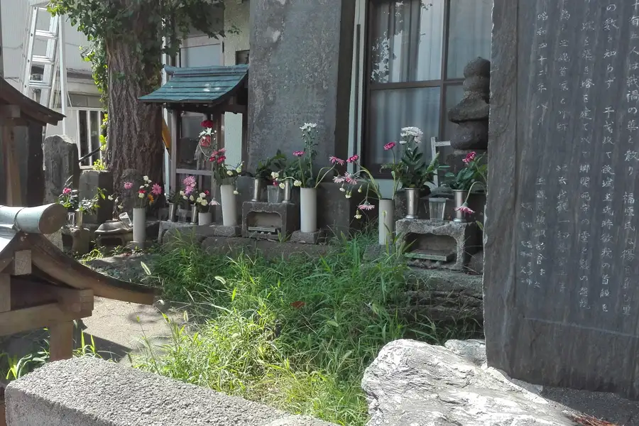 戦いにより甘粕氏など多くの武士が戦死しこれを弔うため首塚が建てられました。玉垣をめぐらせた首塚には大きな碑文のほか馬頭観音や六地蔵も祀られています。