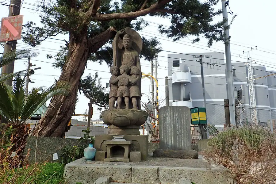 滑川の広場に魚籃観音の石碑があります。魚籃観音は三十三観音のひとつ、手に魚を入れたかごを持っている像と、大魚に乗っている像とがあります。羅刹らせつや毒竜・悪鬼の害を除く巧徳があると言います。