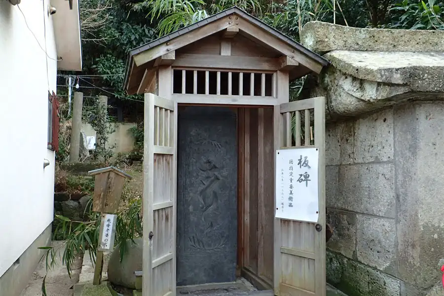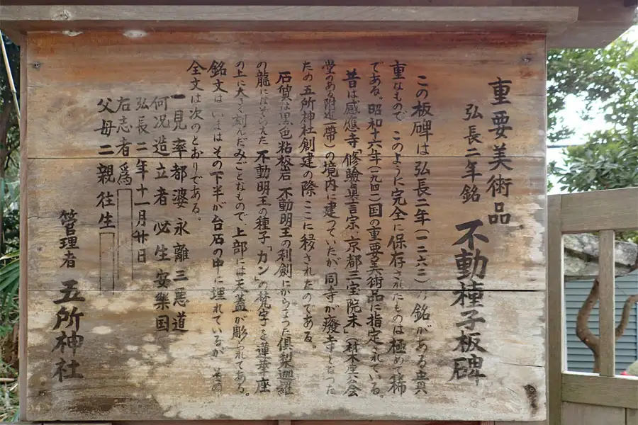 国の重要美術品に指定されている板碑は弘長2年(1262年)の銘があるもので不動明王の種子「カン」の梵字が刻まれたものと言います。