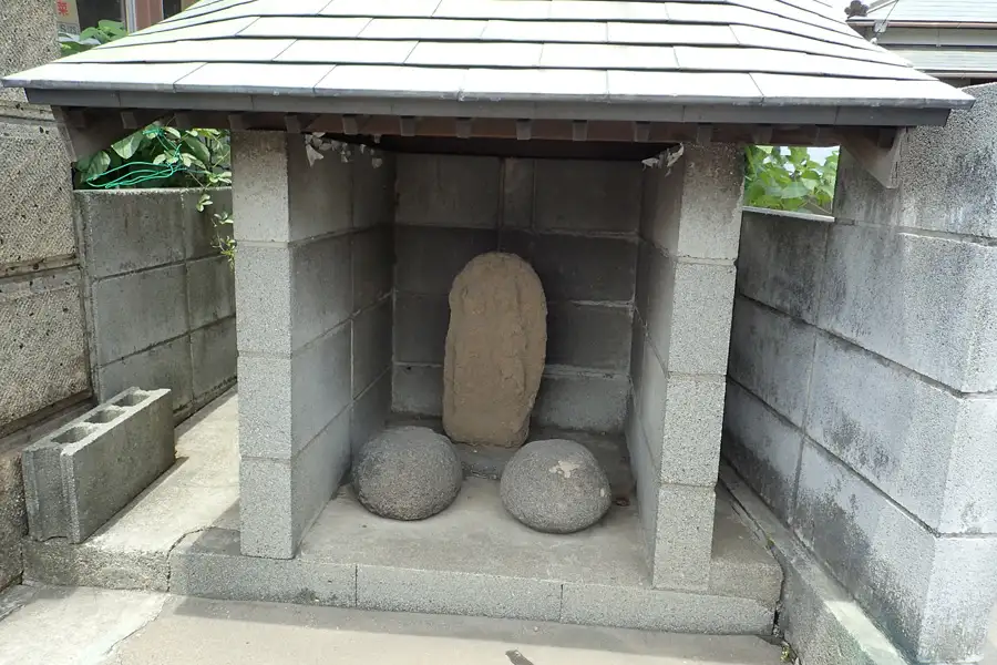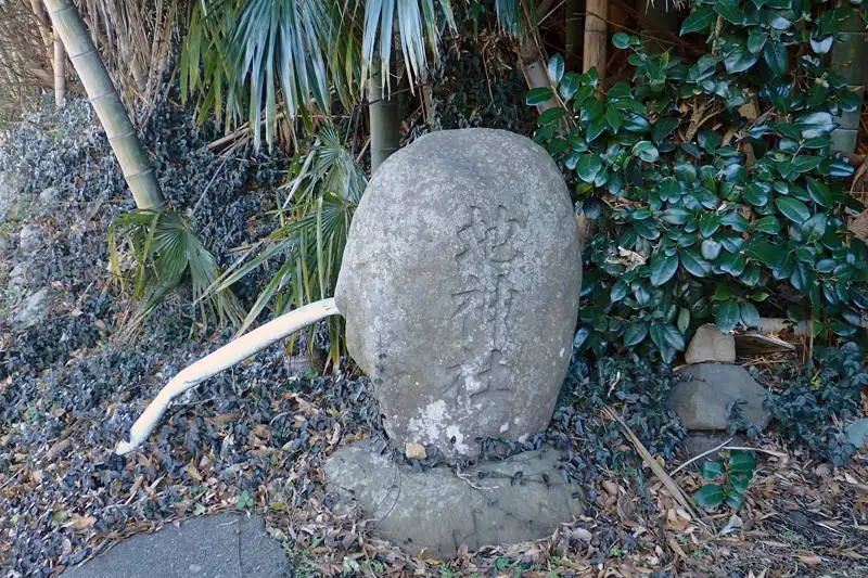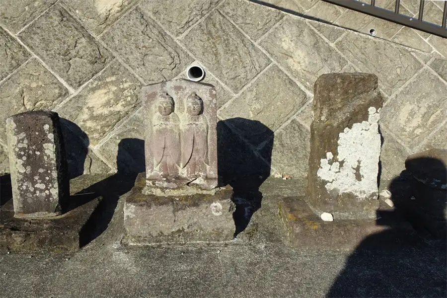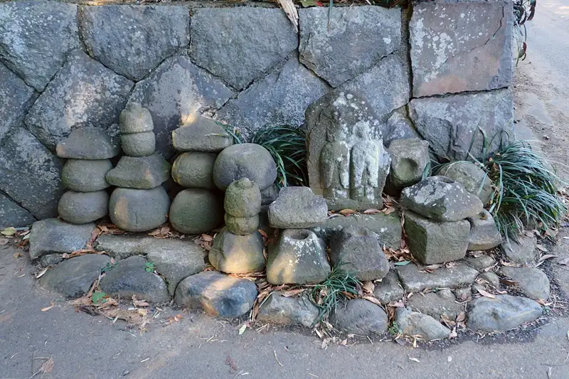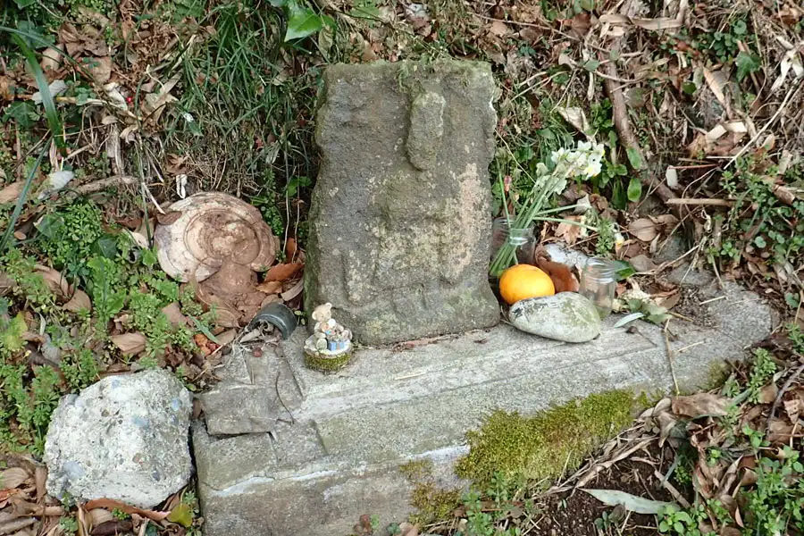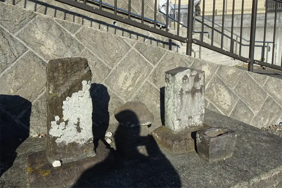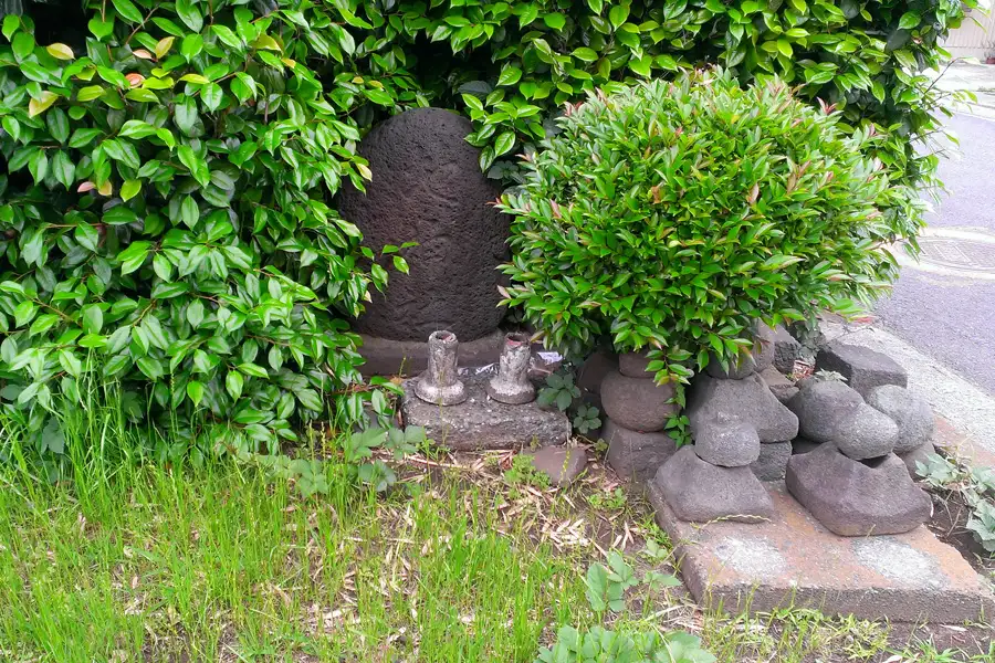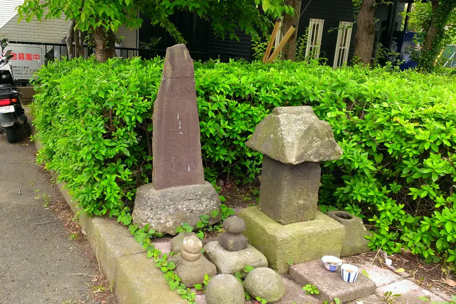 鵠沼小学校近くの住宅街の曲がり角に道祖神と石塔がありました。