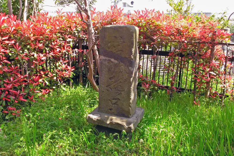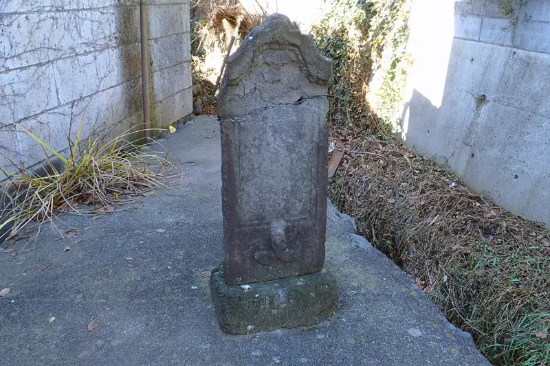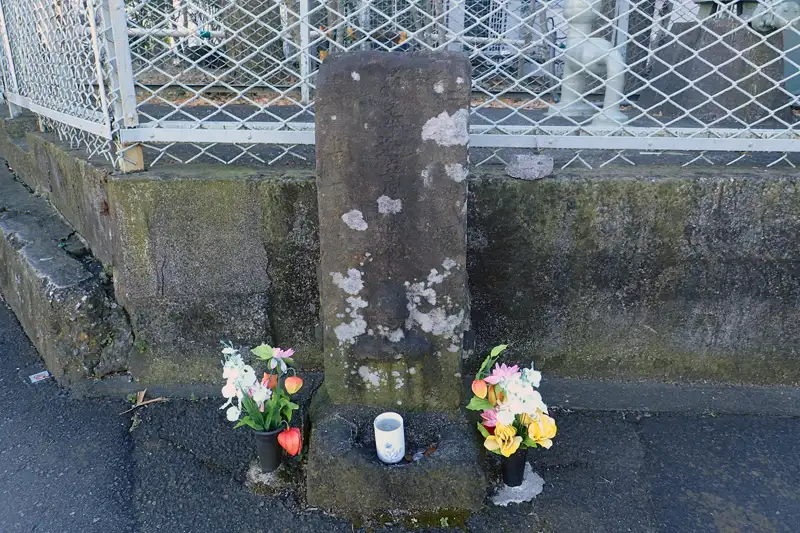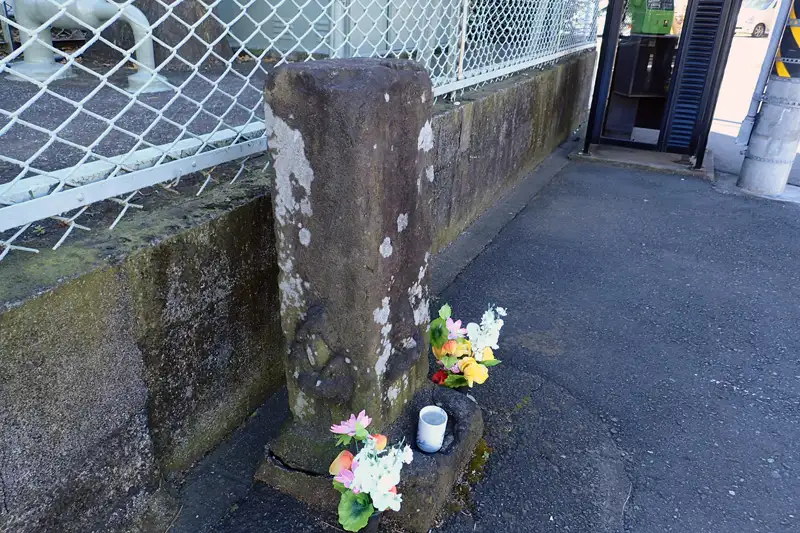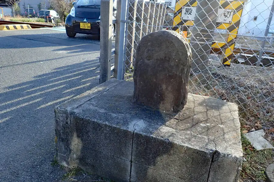 日立精工の工場傍の舗装道路に古い石碑があります。石面は風化し読み取れませんが供養塔のようです。