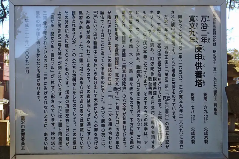 案内板によると万治2年と寛文9年に建立された庚申塚と言います。万治2年は西暦1659年、寛文9年は西暦1669年で徳川4代将軍家綱の時代です。