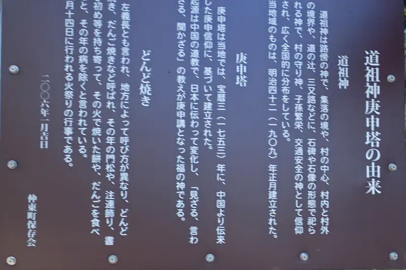 ウィキペディアによると庚申信仰はまた神道の猿田彦神とも結びついているが、猿の字が庚申の申に通じたことと、猿田彦が塞の神とも同一視され、これを幸神と書いて「こうしん」とも読み得たことが原因になっている言います。道祖神の側に幸神と書かれた古い石碑がありました。