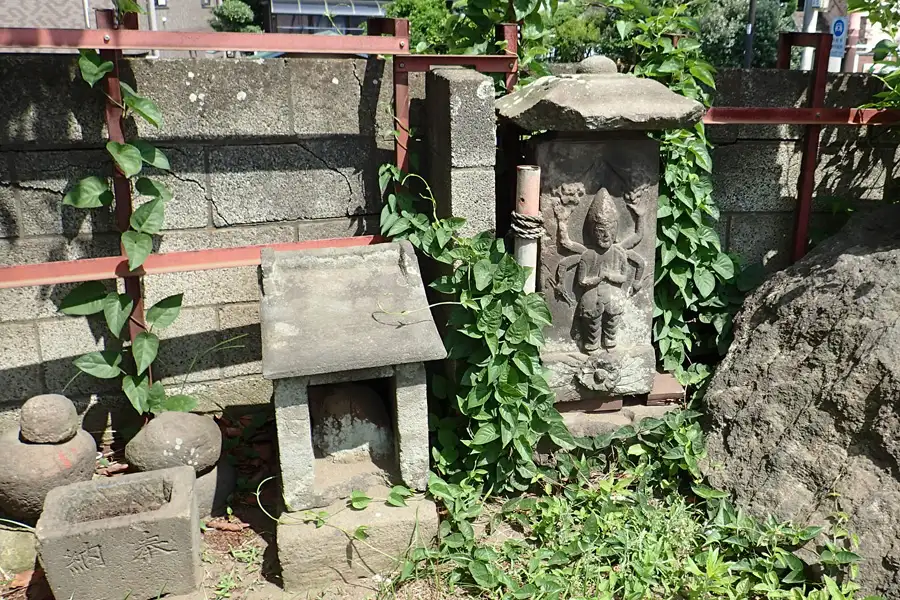住宅地の中の道端に庚申塚や馬頭観音が祀られています。