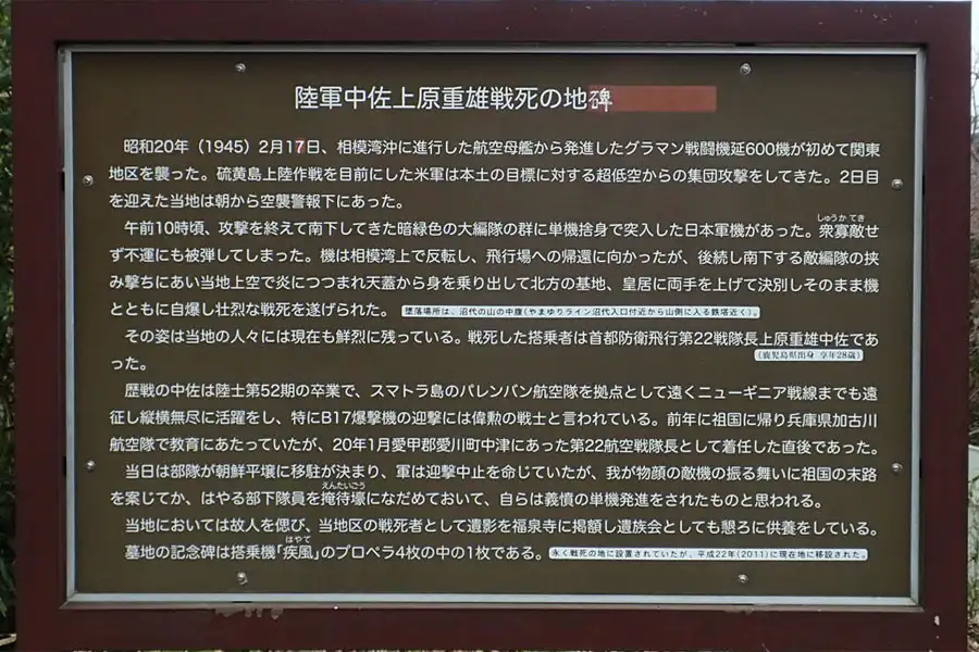 王子神社近くの道端に上原中佐戦士の地碑があります。現地の案内板によると昭和20年2月、相模湾沖に侵攻した空母から飛来したグラマン戦闘機を迎撃に向かった日本機がこの地で撃墜されたところと言います。記念碑は搭乗機、疾風のプロペラの一枚です。