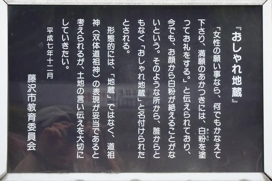養命寺の反対側に歩道におじゃれ地蔵が祀られています。化粧をした姿からおしゃれと名付けたようですが道祖神です。